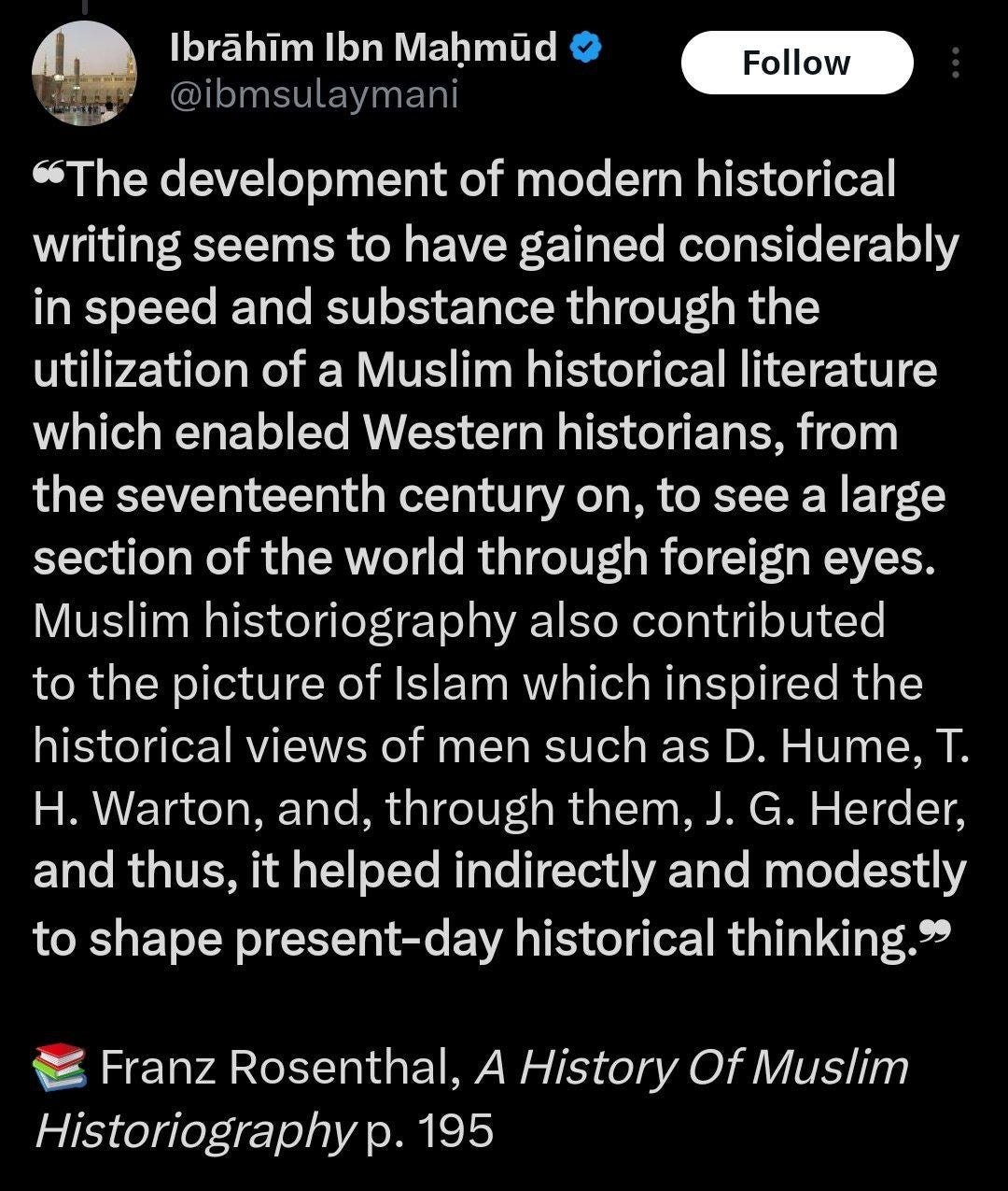 Moreover, while impressive, his work was focused on on Islamic and Arab history. He did not compare texts from different civilizations or study Greek or Roman histories critically. His approach was not universalist in a way the thinking of European historicists was.