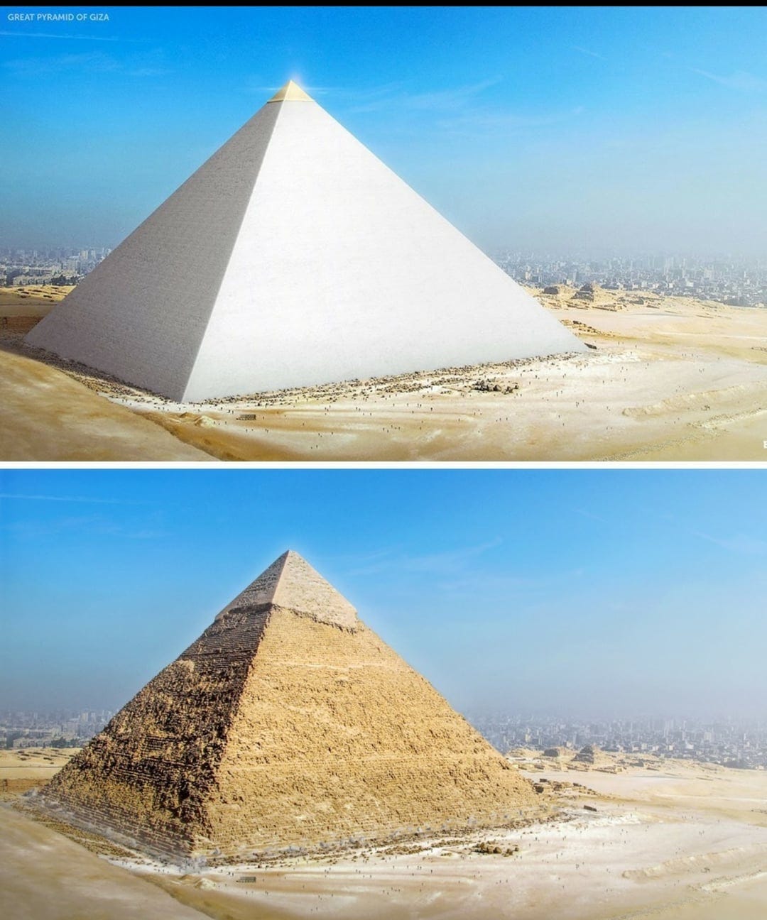 The pyramids were quarried for building material. The original white limestone that covered the pyramids is gone because it was stripped for building in Cairo.