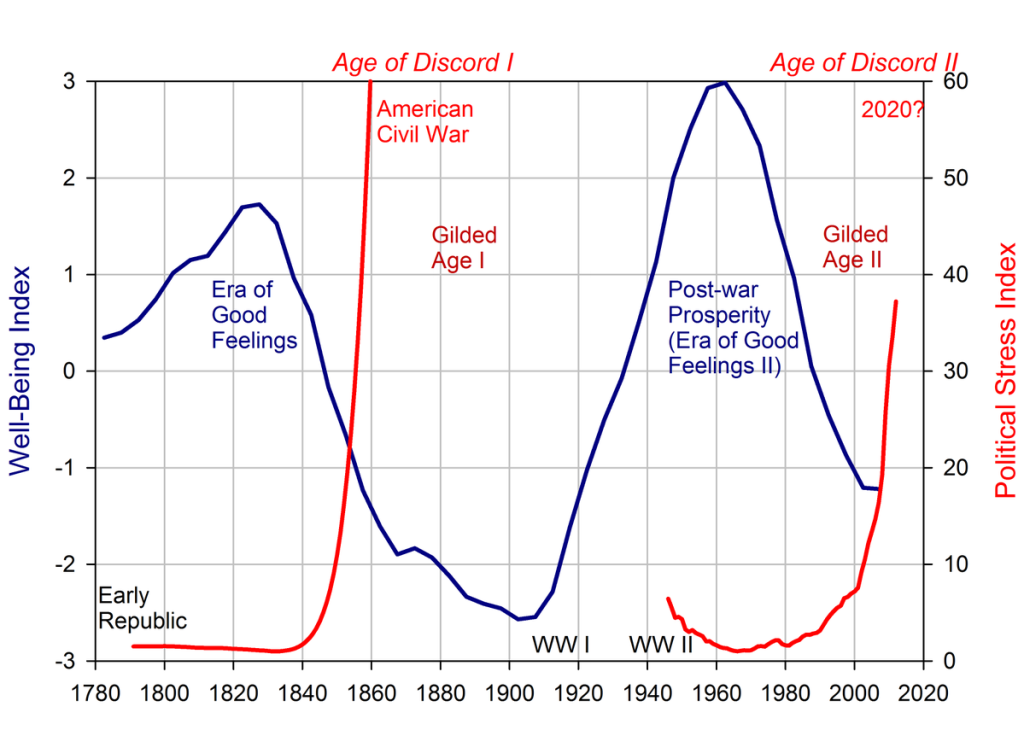 Back to Turchin, his model had predicted social unrest in America peaking in the early 2020s, but this doesn’t necessitate a civil war. The periods of the early 1970s and late 1920s were also times of intense unrest, but each was followed by long periods of stability without passing through a civil conflict.